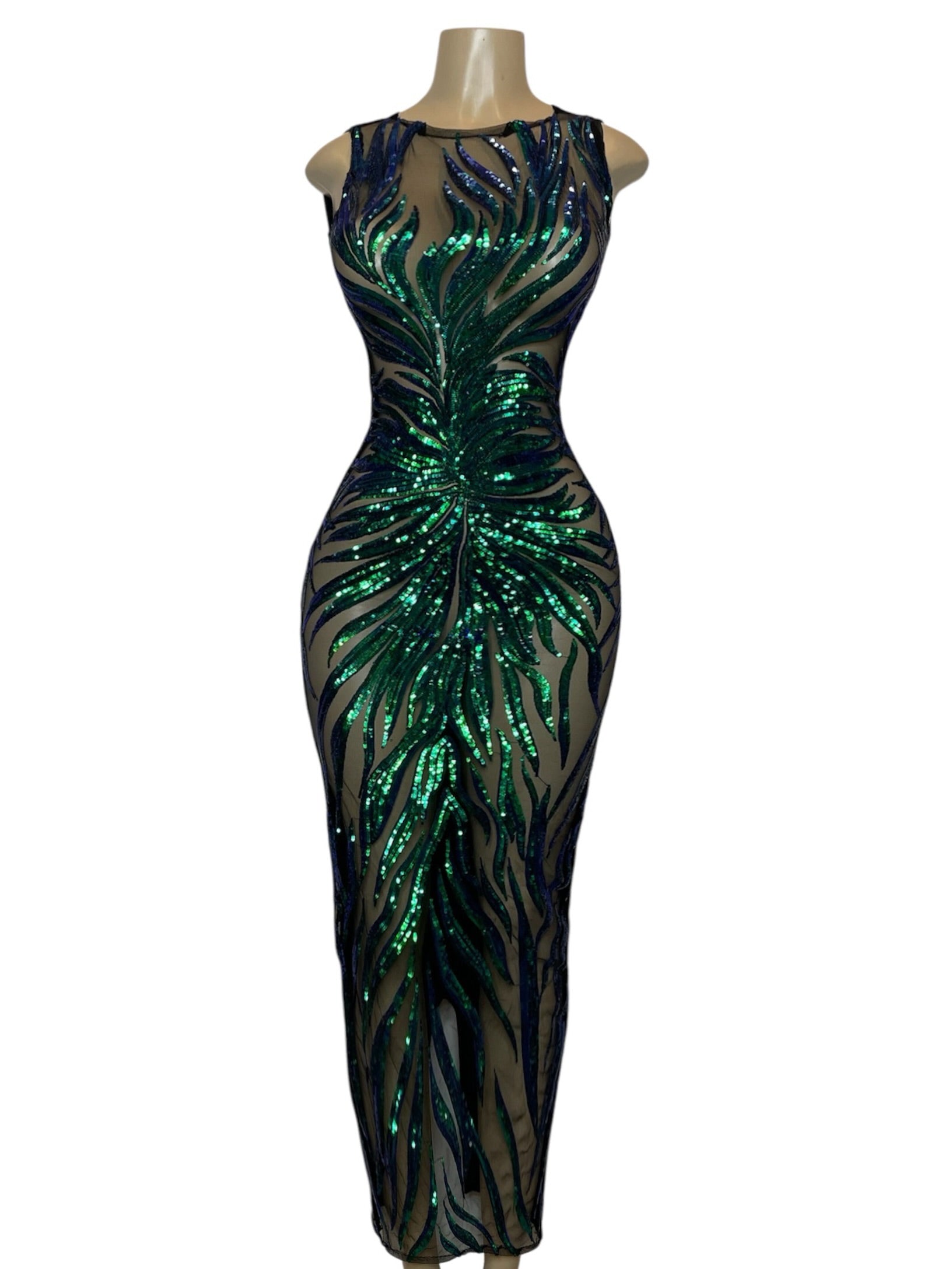 This high-quality midi dress boasts elegant handmade sequin detailing and a velvet back for added sophistication and comfort. Crafted from a premium, highly stretchable fabric and featuring a convenient zipper closure on the back.