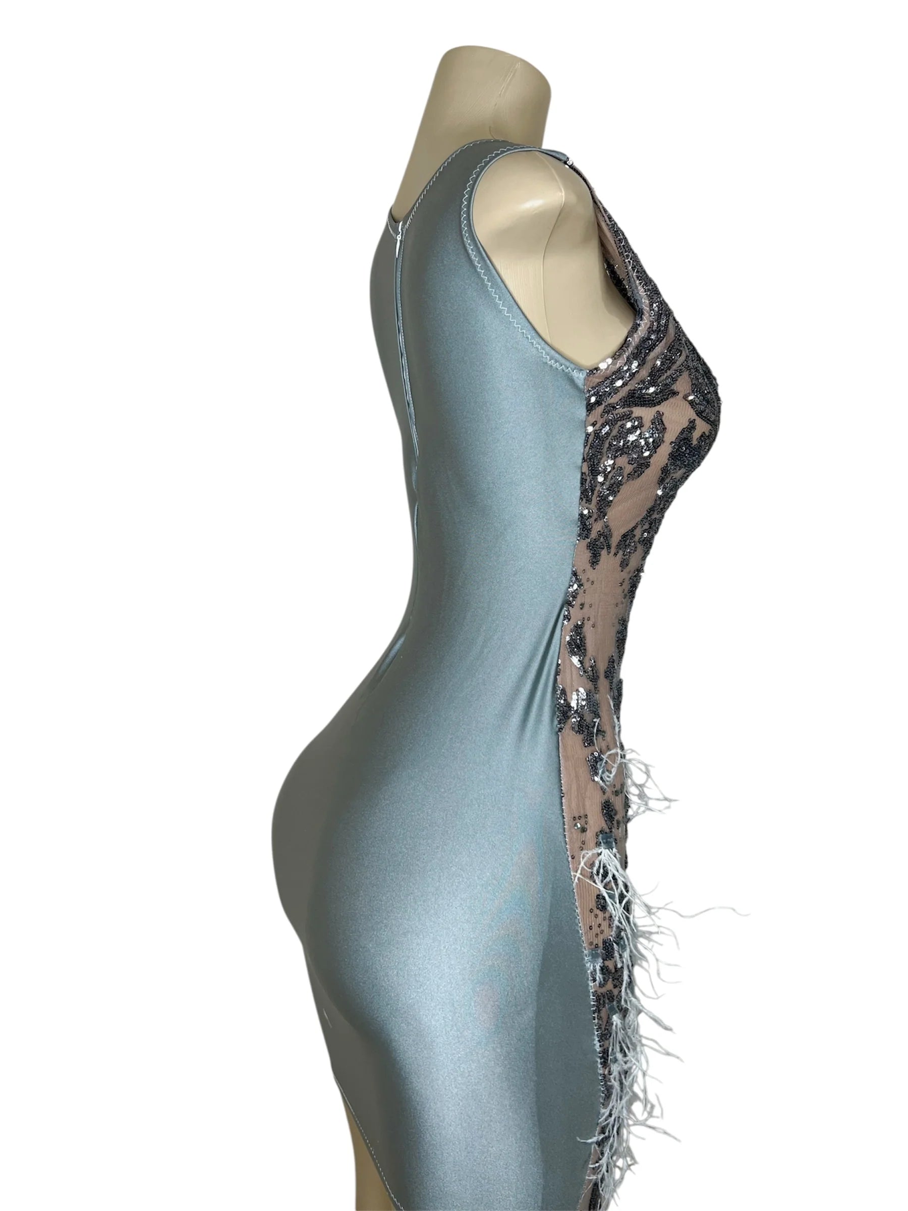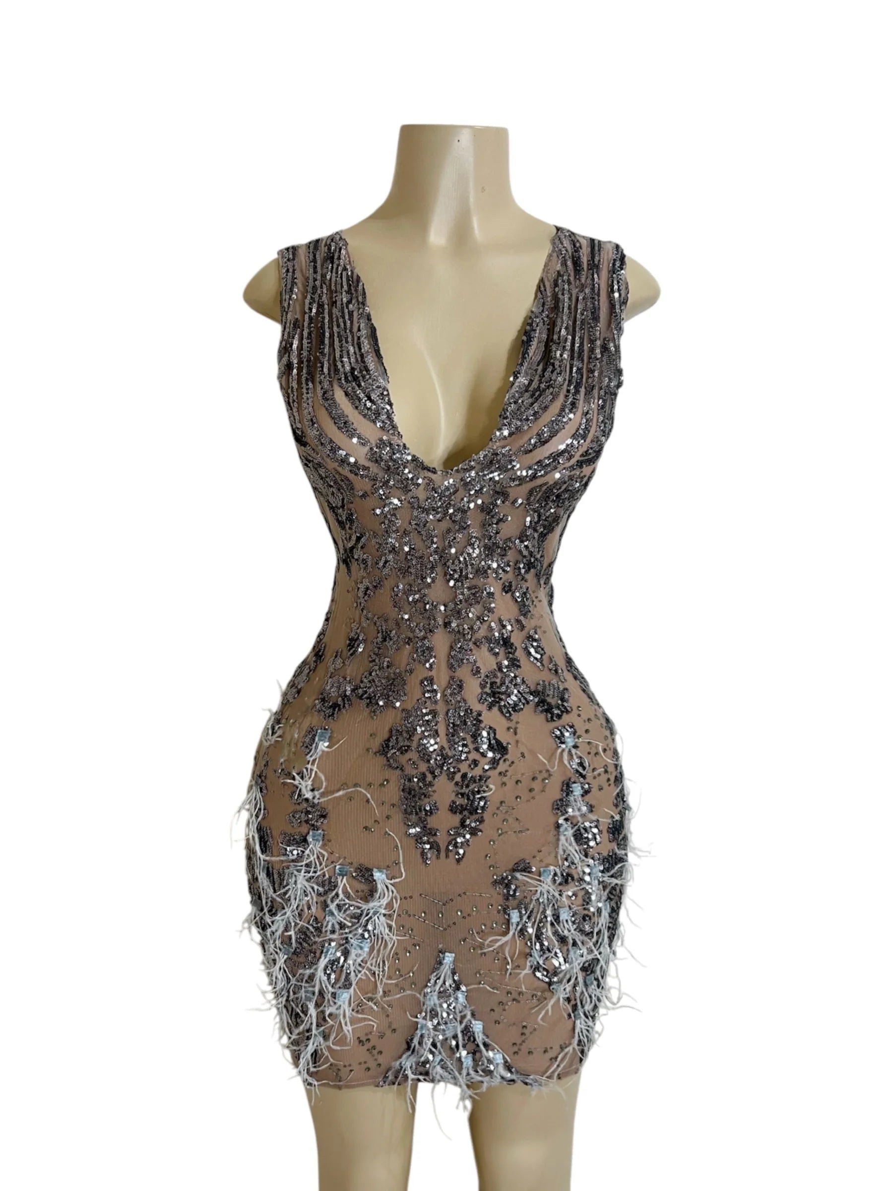 this is a beautiful handmade sequins And feather dress with matching nylon fabric on the back soft and comfortable. Made of a super soft fabric with great stretch Zipper closure